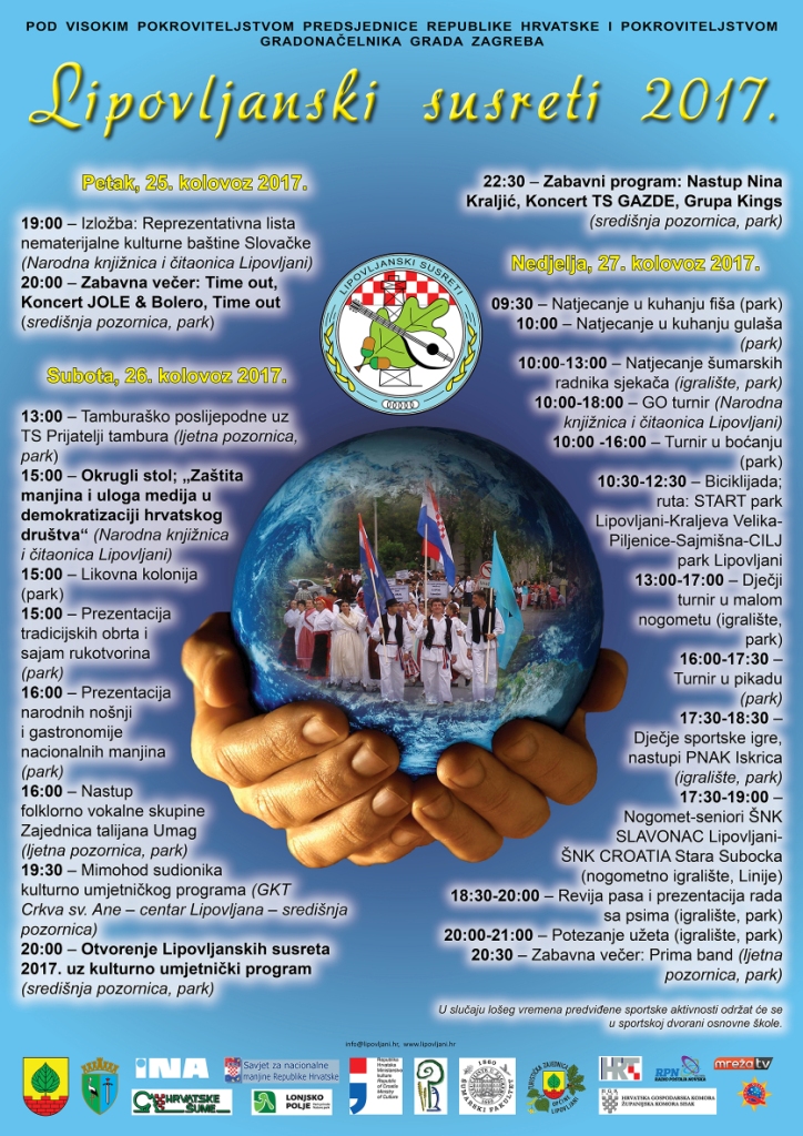 plakatLS2017'Lipovljanski susreti', središnja i najveća manifestacija nacionalnih manjina Republike Hrvatske ove godine održati će se 25., 26 i 27. kolovoza.