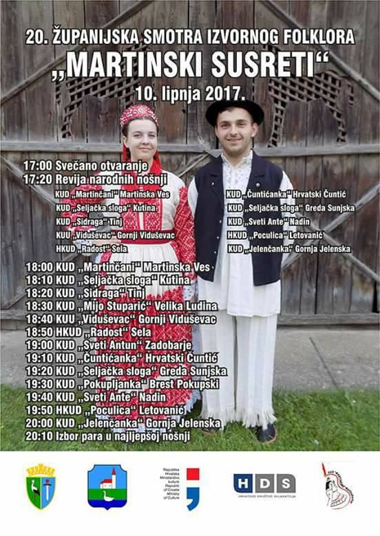 „Martinski susreti“, 20. Županijska smotra izvornoga folklora održana je ove subote, 10. lipnja u Martinskoj Vesi u organizaciji KUD-a Martinčani. U programu smotre u kojem su se predstavljala društva koja su na ranije održanim predsmotrama po regijama u Sisačko-moslavačkoj županiji zaslužili biti na završnoj smotri sudjelovala su društva: KUD Martinčani- Martinska Ves,
